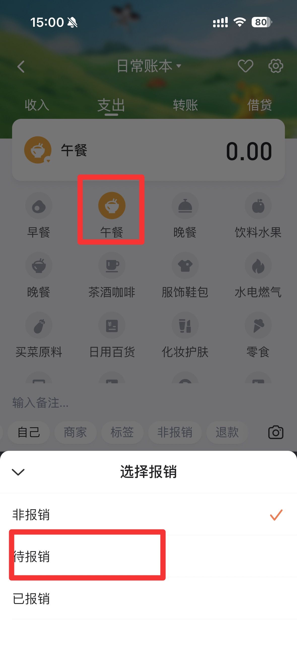 - 记一笔选项栏 - 报销位置,改成“待报销”