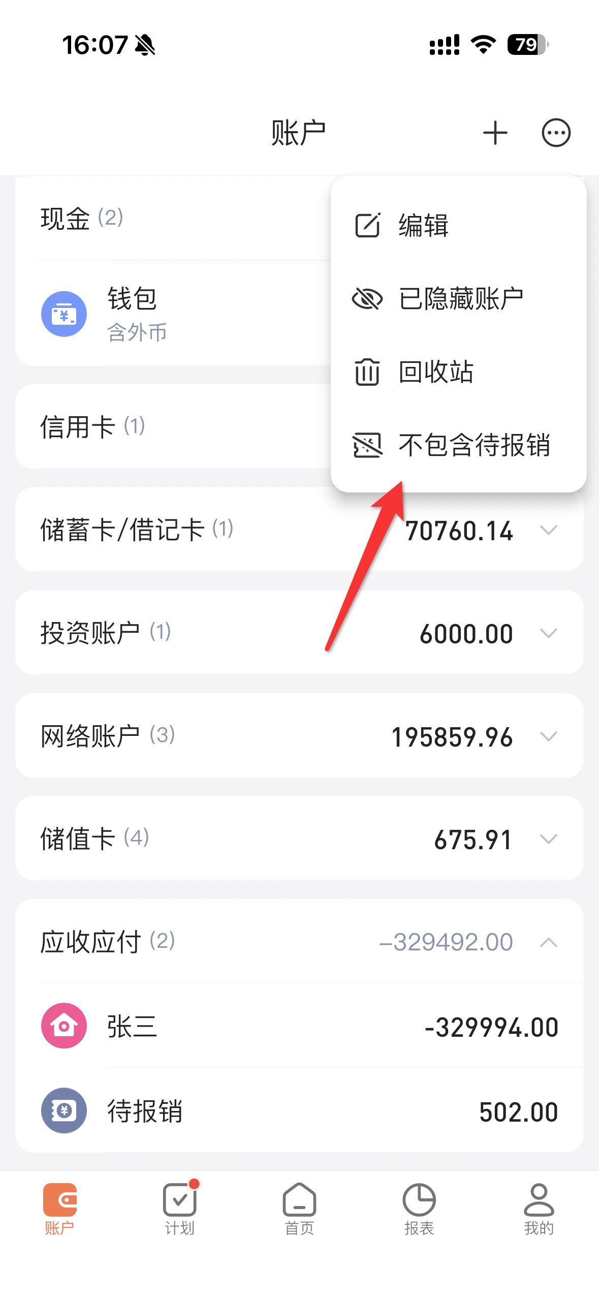 账户页-顶部右上角【...】里点击-不包含待报销,则报销账不会计入净资产、总资产的统计