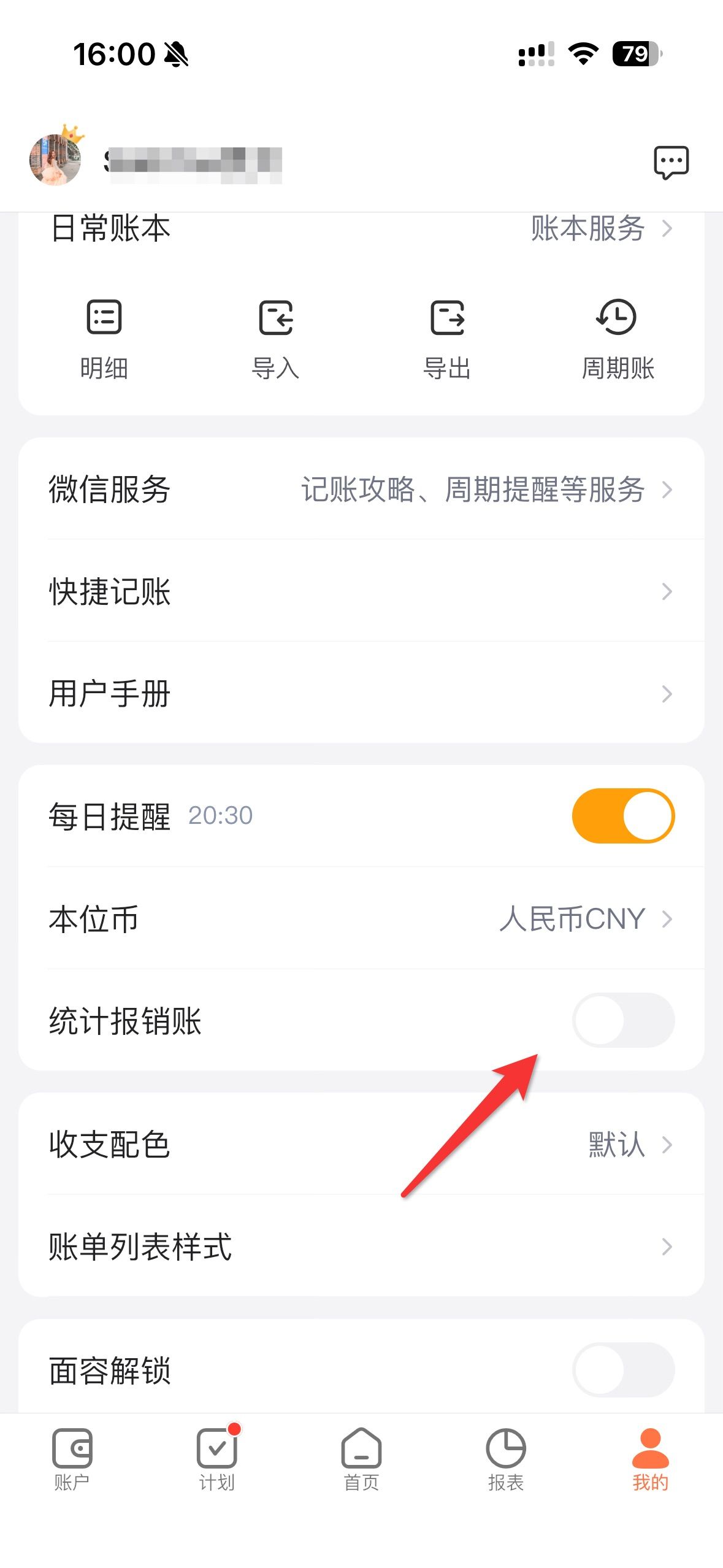 - 我的页面- 开启【统计报销账】开关,则账本统计会统计报销账